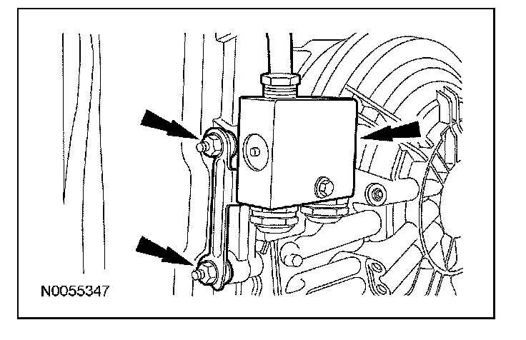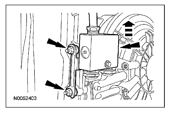15. Remove the 2 nuts, pull the transmission fluid cooler thermal bypass valve straight up and position it aside.