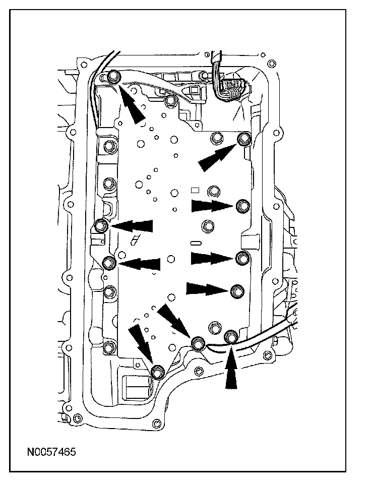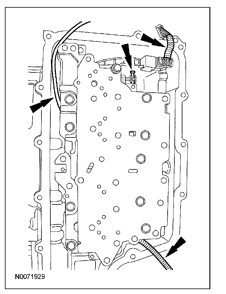 5. CAUTION: Make sure not to pinch the turbine shaft speed (TSS), output shaft speed (OSS) or transmission range (TR) sensor wiring harnesses when installing the solenoid body. Damage to the wiring harness will occur.