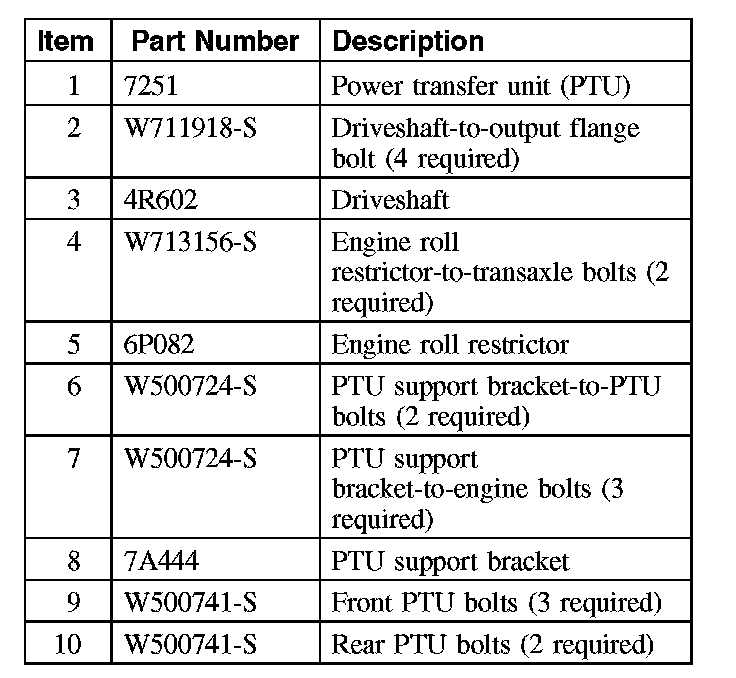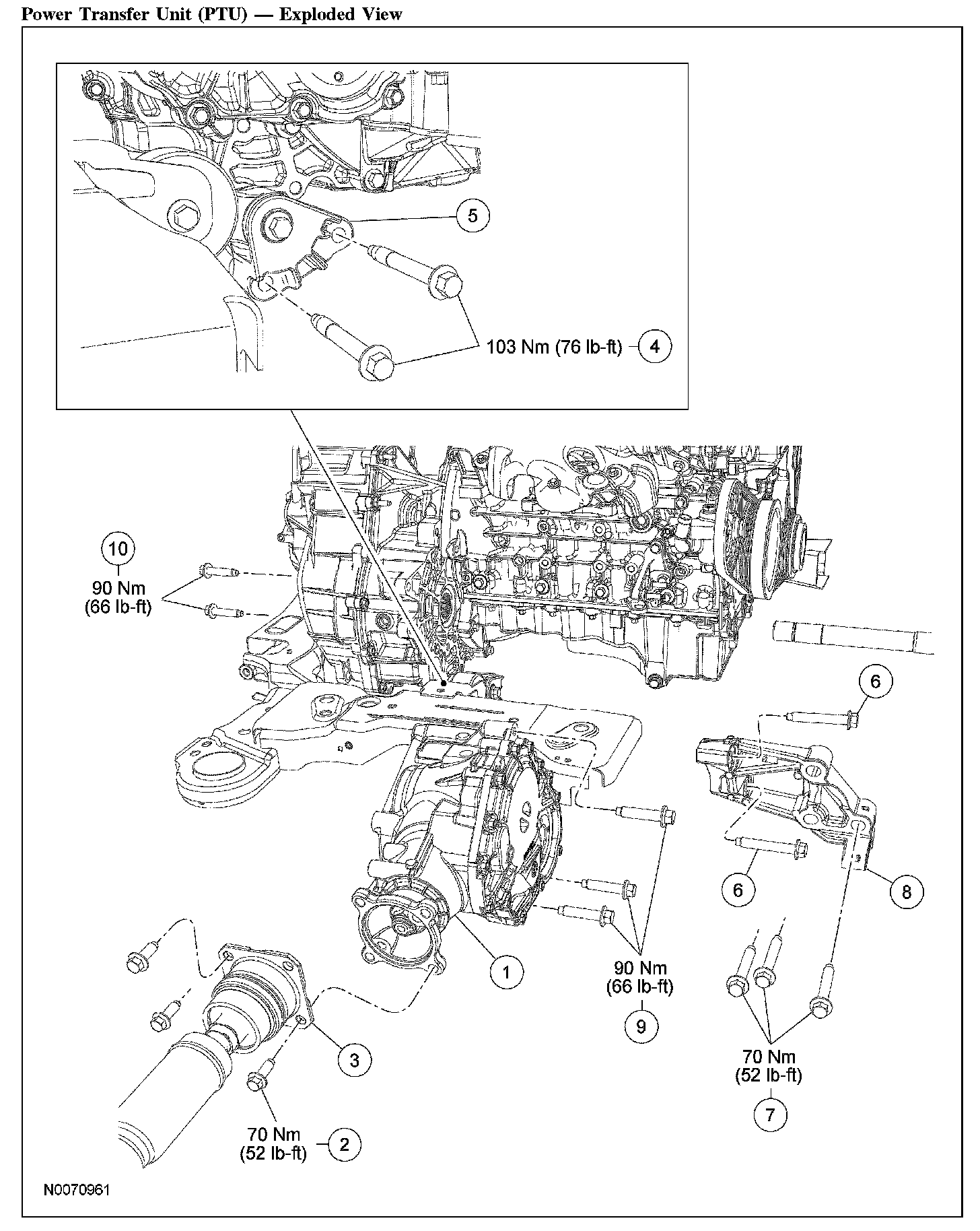 7. Position the power transfer unit (PTU) in place and install the 5 PTU bolts.
