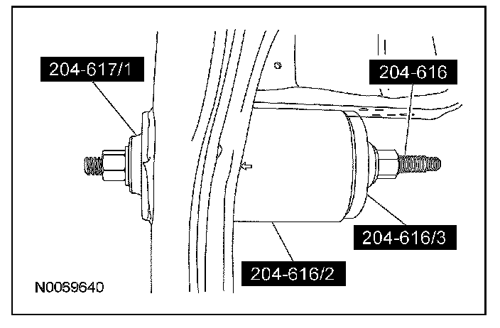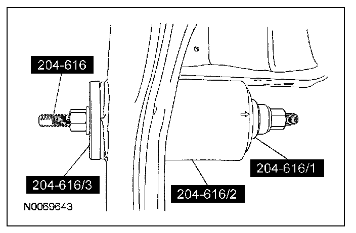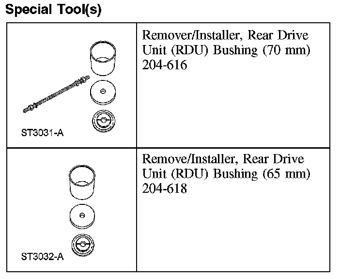- When installing the RDU bushing, 204-616/2 will fall away as the RDU bushing is installed into the subframe. The special tool does not control the depth of the bushing. The RDU bushing is fully seated when the special tool falls away from the subframe, do not continue to tighten the special tool.