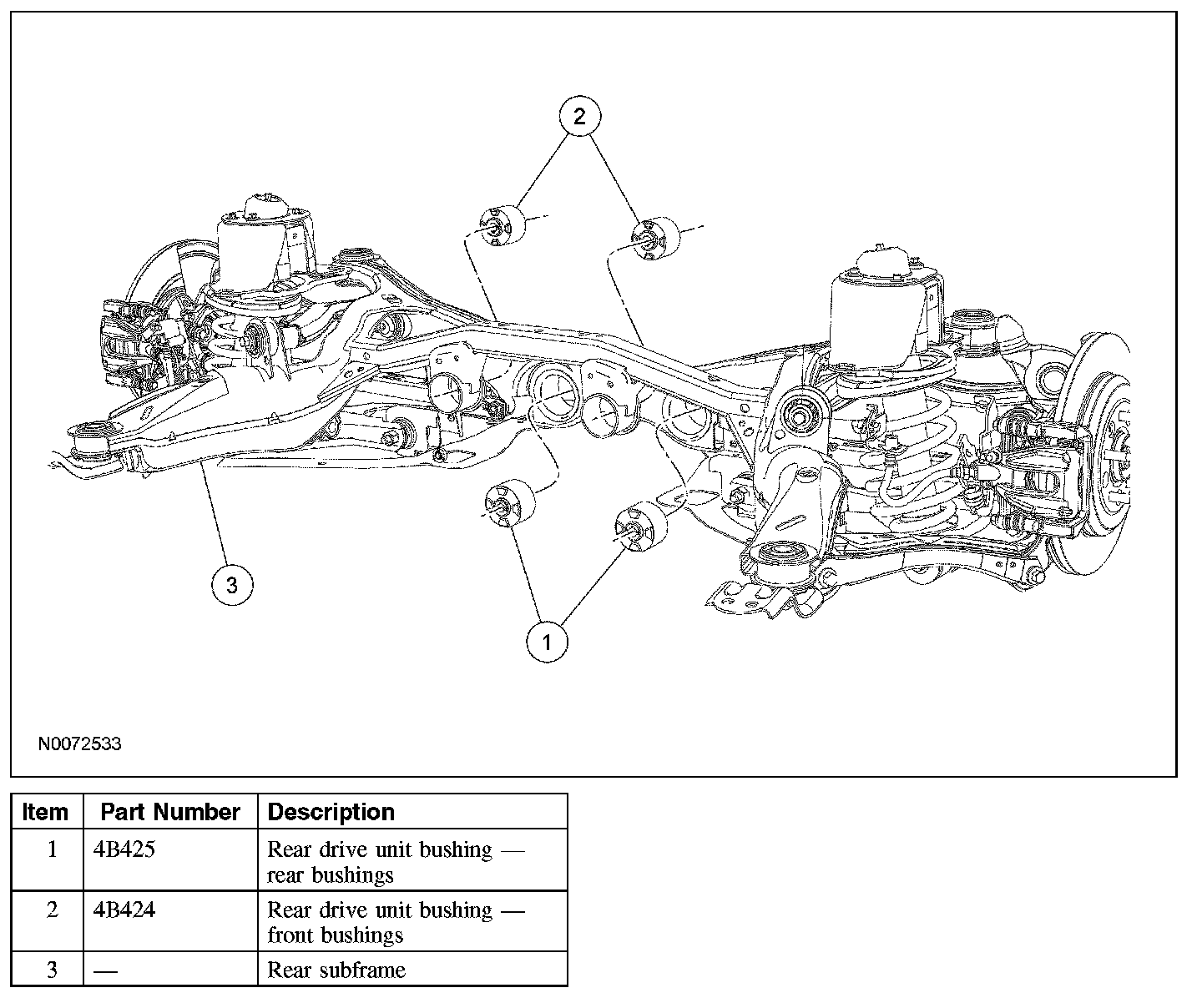 NOTE: There are 2 rear drive unit (RDU) rear bushings in the rear subframe, this procedure shows how to remove one bushing. The procedure for the remaining RDU bushing is identical.