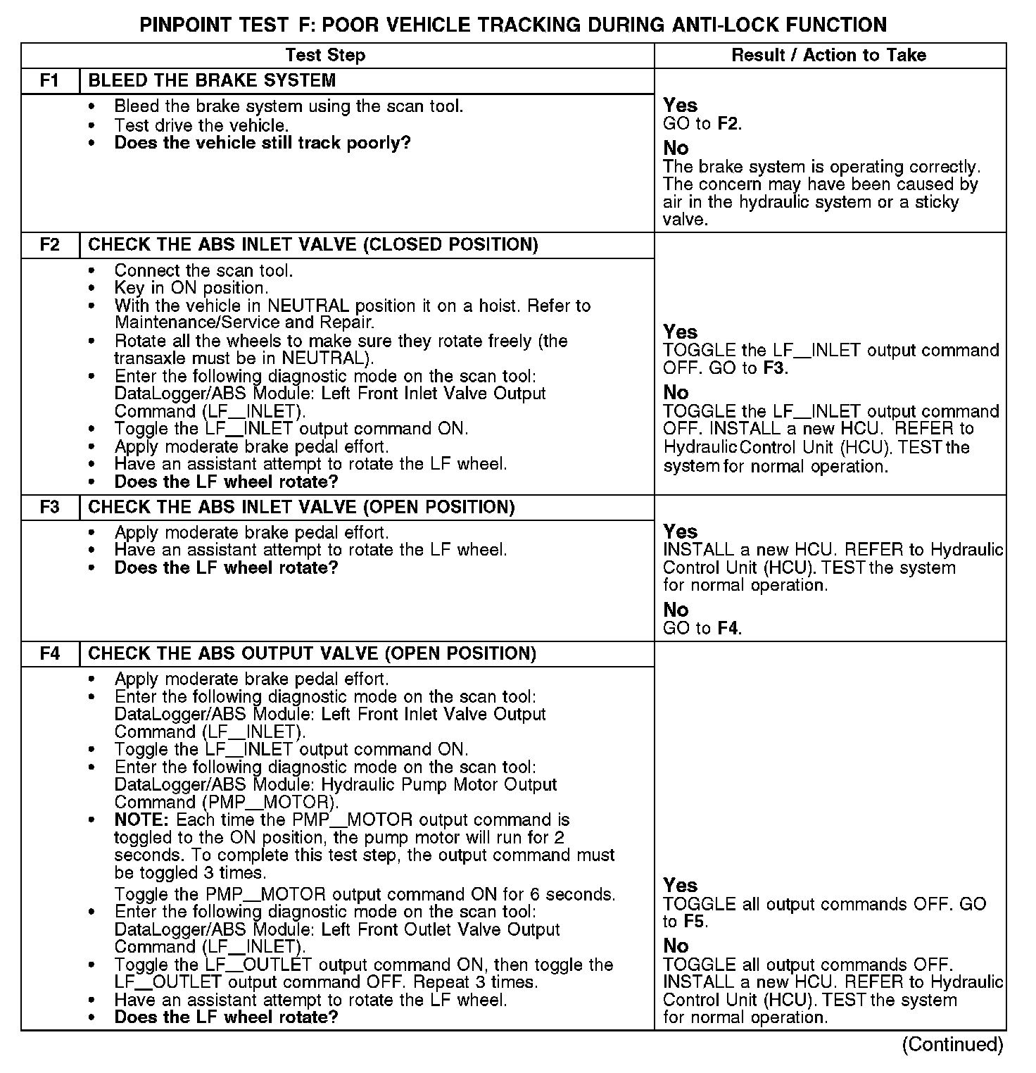 Pinpoint Test F: Poor Vehicle Tracking During Anti-lock FunctionRefer to Vehicle Dynamic Systems for schematic and connector information.
