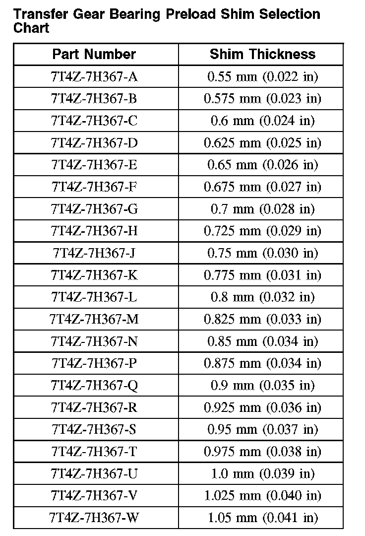 Transfer Gear Bearing Preload Shim Selection Chart