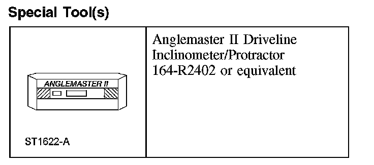 Driveline Angle MeasurementNOTE: This procedure does not apply to constant velocity (CV) joints, flex couplers or double cardan joints that are used in some driveshafts. This check is for single-cross and roller-style joints found in the driveshafts.