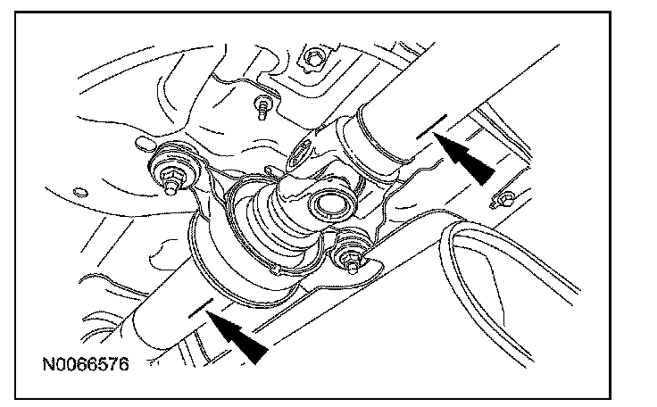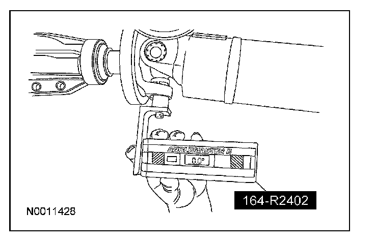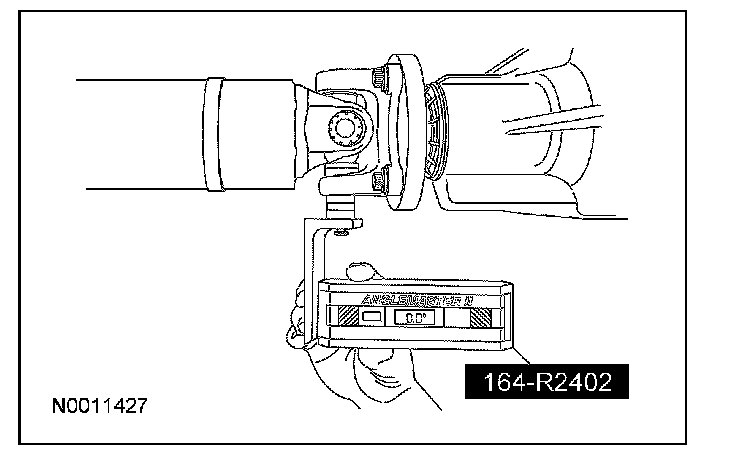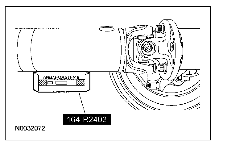 6. If the angle is not within specifications, repair or adjust to obtain the correct angle. Inspect the engine mounts, transmission mounts, center support bearing mounting, rear suspension, rear axle, rear axle mounting or the frame for wear or damage.