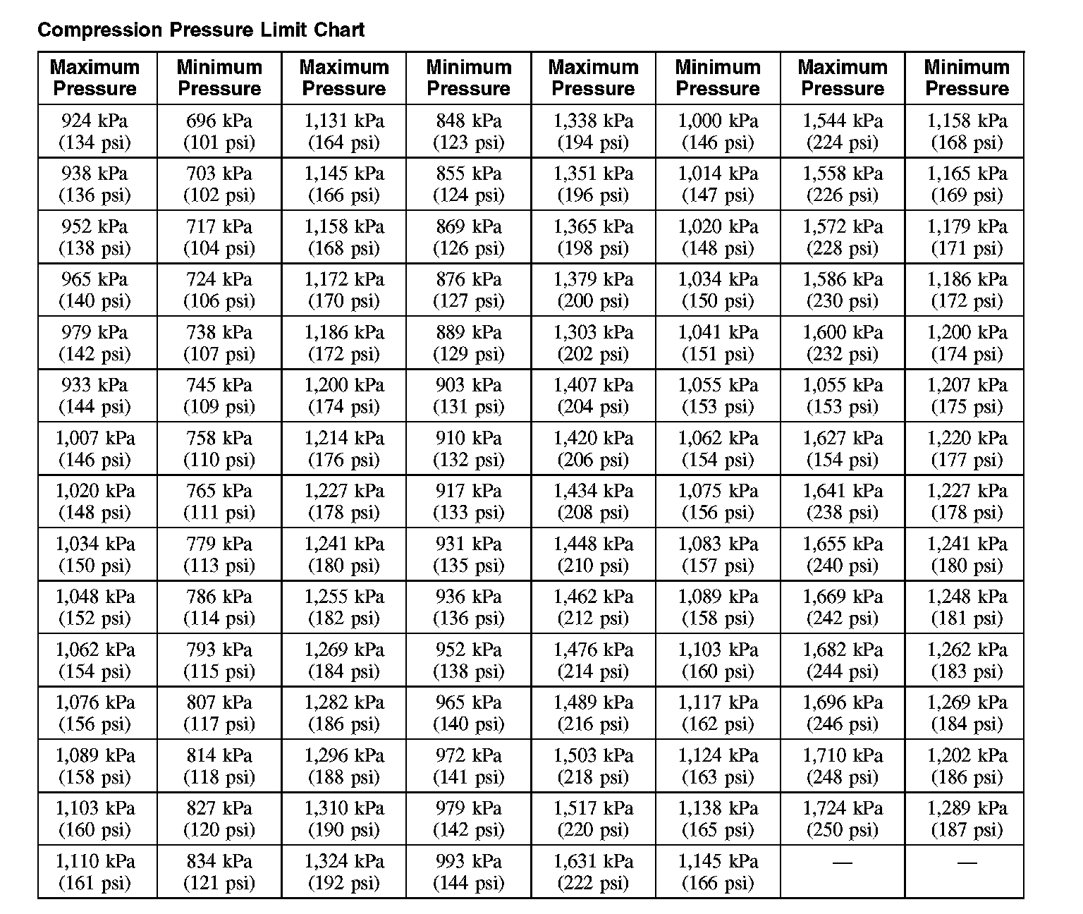 The indicated compression pressures are considered within specification if the lowest reading cylinder is at least 75% of the highest reading. Refer to the Compression Pressure Limit Chart.