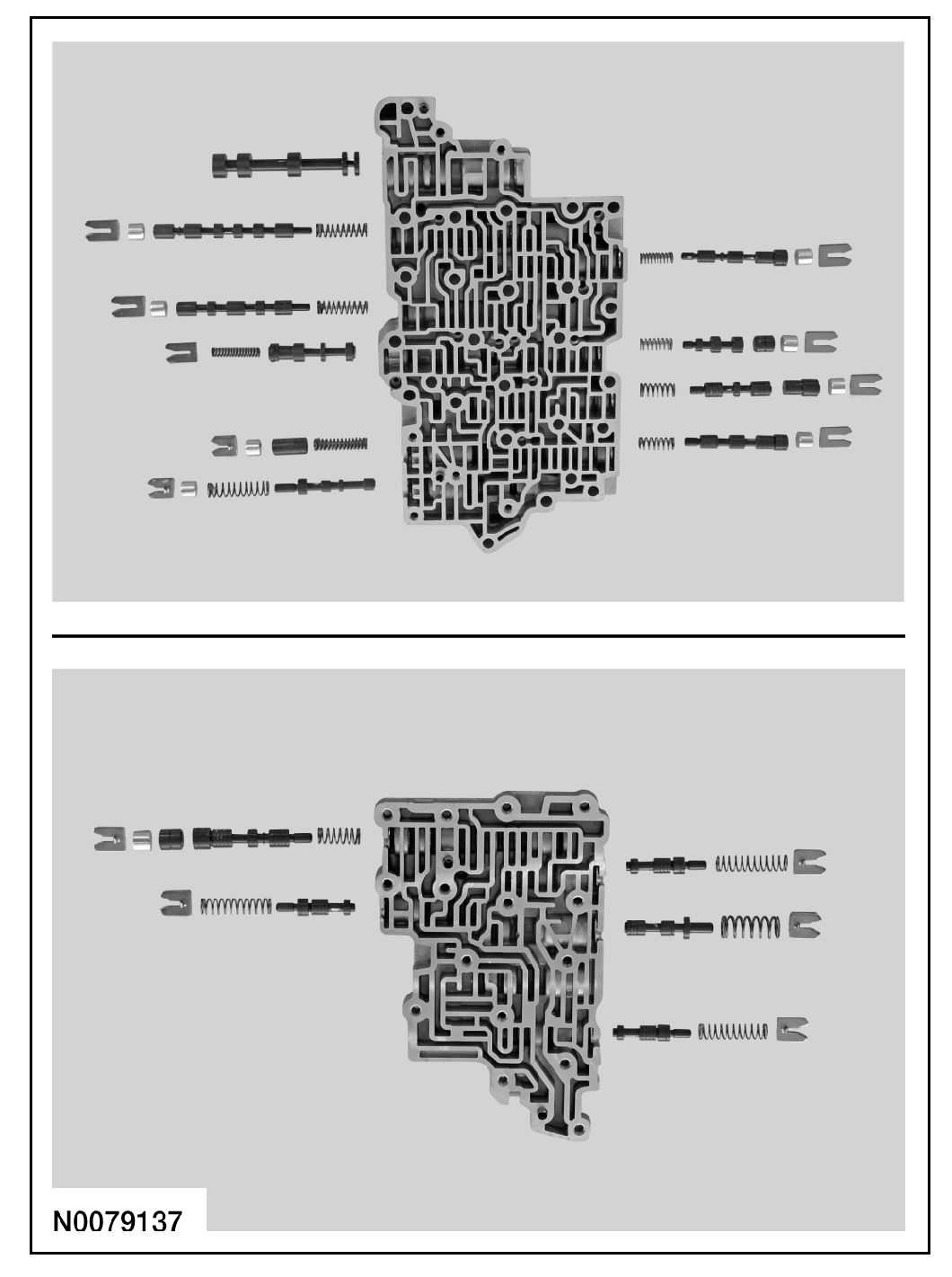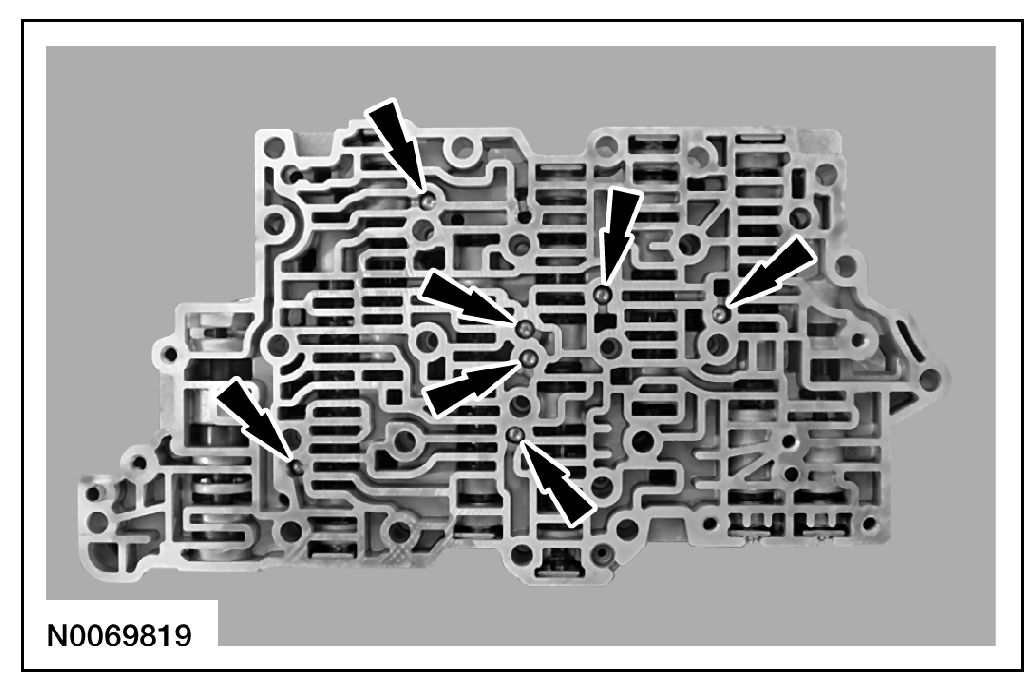8. NOTICE: Remove the valves by tapping the valve body on the palm of the hand to slide the valves out of the bores. It may be necessary to remove the valves and springs using a pick. If it is necessary to use a pick, use extreme caution to prevent damaging the valves or valve bores. If necessary, disassemble parts of the main control valve body in small groups. Take special care when handling the main control components, since they are the most precise and delicate parts of the transaxle. Neatly arrange the parts as they are removed to avoid mixing similar pieces.