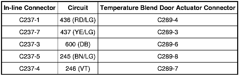 Under normal operation, the temperature blend door actuator is supplied voltage on circuit 246 (VT)/1040 (RD/BK) and ground on circuit 245 (BN/LG)/57 (BK). As the temperature selection changes it varies the voltage on circuit 437 (YE/LG) to the temperature blend door actuator. The temperature control potentiometer receives voltage from the temperature blend door actuator through circuit 436 (RD/LG). Ground for the temperature control potentiometer is supplied from the temperature blend door actuator through circuit 600 (DB).