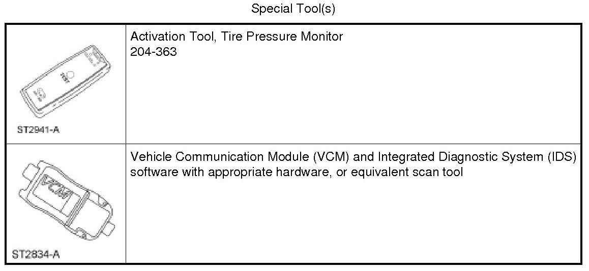 NOTE: If the vehicle has been stationary for more than 30 minutes, the sensors will go into a "sleep mode" to conserve battery power. It will be necessary to wake them up so they will transmit the latest tire pressure information to the Driver Door Module (DDM). For additional information, refer to Tire Pressure Monitoring System (TPMS) Sensor Activation Programming and Relearning.