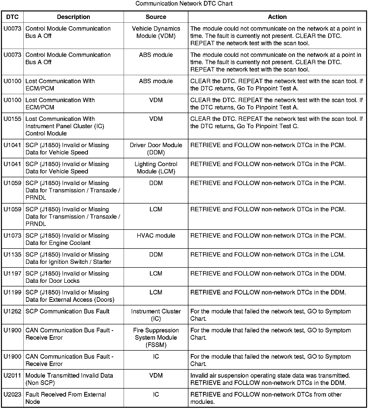 NOTE: Network DTCs (U-codes) are often a result of intermittent concerns such as damaged wiring or low battery voltage occurrences. Additionally, vehicle service procedures such as module reprogramming will often set network DTCs. Replacing a module to resolve a network DTC is unlikely to resolve the concern. To prevent repeat network DTC concerns, inspect all network wiring, especially connectors. Test the vehicle battery, refer to Battery.
