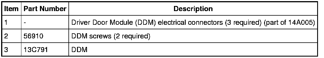 NOTE: The steps included in the DDM removal and installation procedure are critical to restoring the vehicle security and tire pressure monitoring systems to normal operation. A new DDM is delivered in a manufacturing mode with 6 pre-set DTCs related to the TPMS. To clear the DTCs, successful configuration of the DDM must occur, followed by successful TPMS sensor training, and a successful self-test, including clearing of the DTCs. The DTCs are as follows: