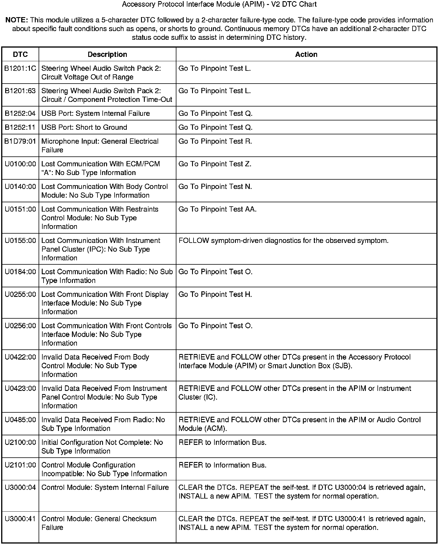 Accessory Protocol Interface Module (APIM) - V2 DTC Chart