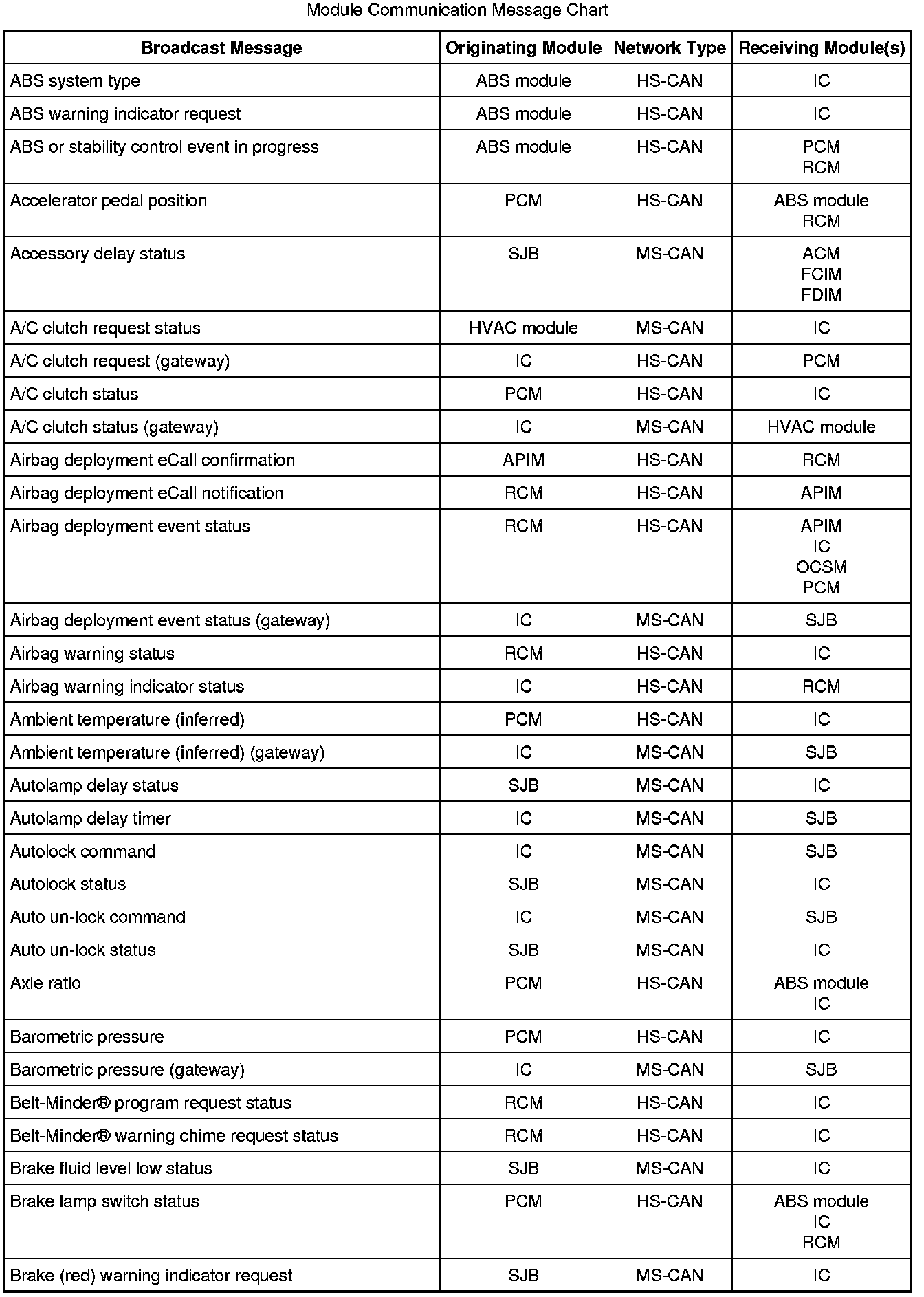 The following chart describes the specific HS-CAN messages broadcast by each module, and the module(s) that receive the message: