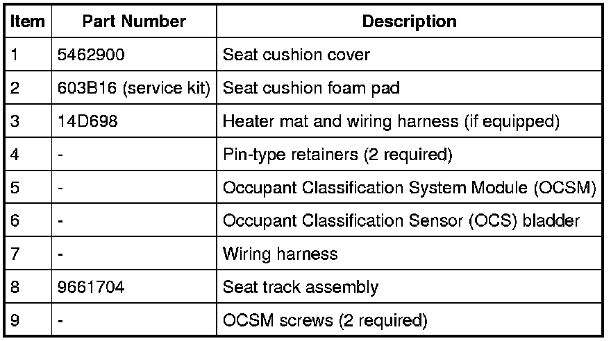 NOTE: Occupant Classification Sensor (OCS) system components, seat cushion foam pad, bladder with pressure sensor and Occupant Classification System Module (OCSM), are calibrated to each other and are serviced as an assembly. If a new OCS system or OCS system component is needed, a new OCS system service kit must be installed.
