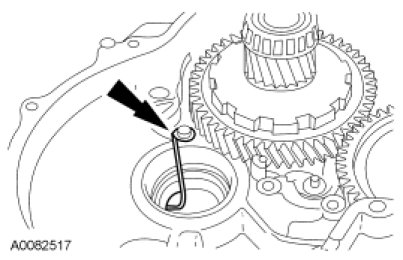 64. NOTICE: Hold the final drive input gear while removing the bearing to prevent it from falling out of the transaxle case or damage to the input gear can occur.