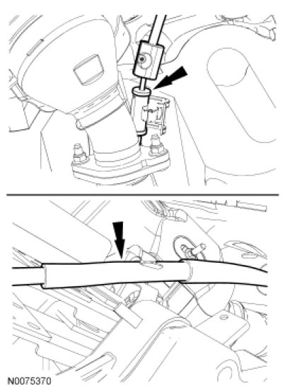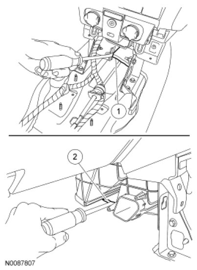 10. NOTE: When installing the selector lever cable, make sure that the selector lever cable locking tabs are locked in place and the selector lever cable end is snapped onto the ball stud. Press the selector lever cable into the selector lever cable bracket and listen for the selector lever cable to click in place. Pull back on the selector lever cable to make sure that it is locked into the selector lever cable bracket. Also make sure that the selector lever cable end is correctly installed onto the ball stud. Pull back on the selector lever cable end to make sure that the selector lever cable end is correctly installed.