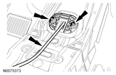 Using a suitable tool, cut the carpet in the center under the heater core and evaporator core housing to gain access to the selector lever cable grommet in the following sequence.