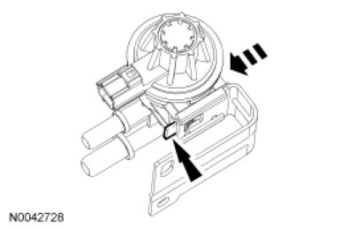 5. Depress the tab and remove the EVAP canister purge valve from the bracket.