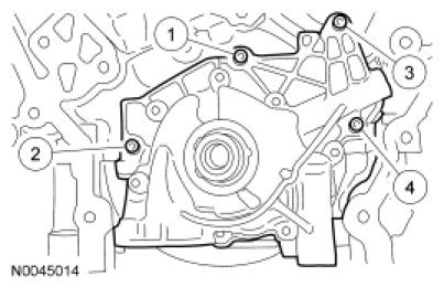 Position the oil pump and install the 4 bolts.