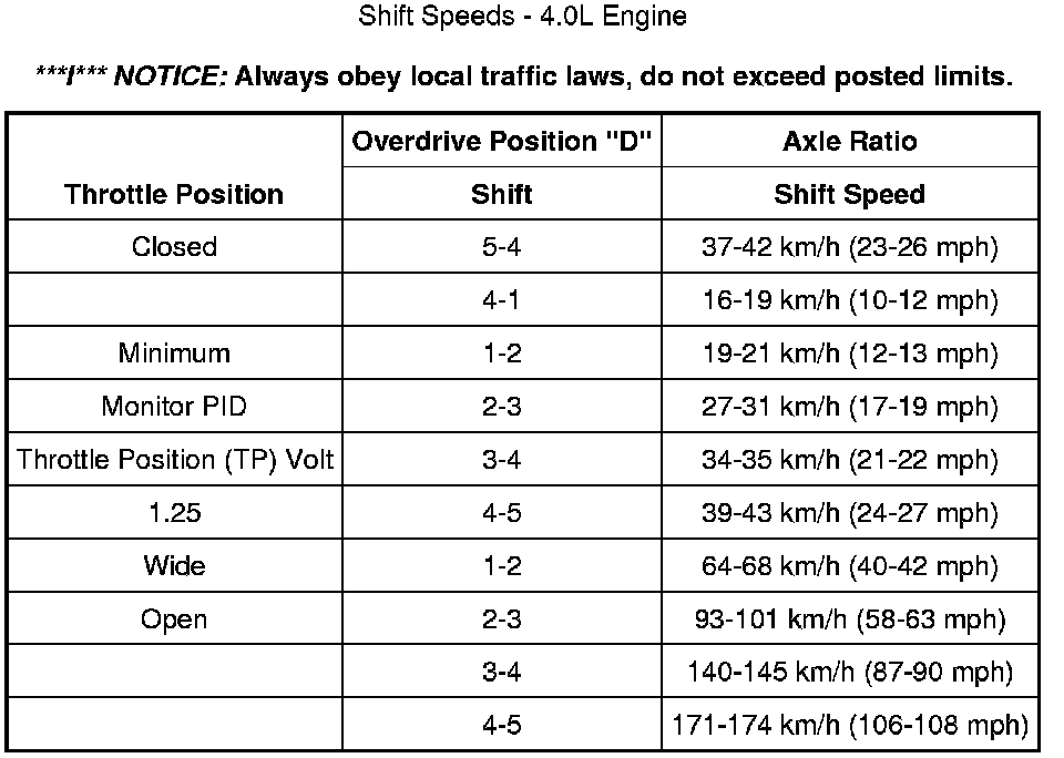 Shift Speeds - 4.0L Engine: