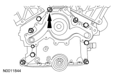 Install the Front Cover Aligner and tighten the 5 bolts and 5 stud bolts.