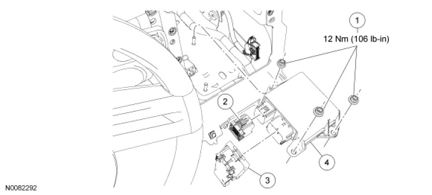 1. WARNING: Always tighten the fasteners of the restraints control module (RCM) and impact sensor (if equipped) to the specified torque. Failure to do so may result in incorrect restraint system operation, which increases the risk of personal injury or death in a crash.