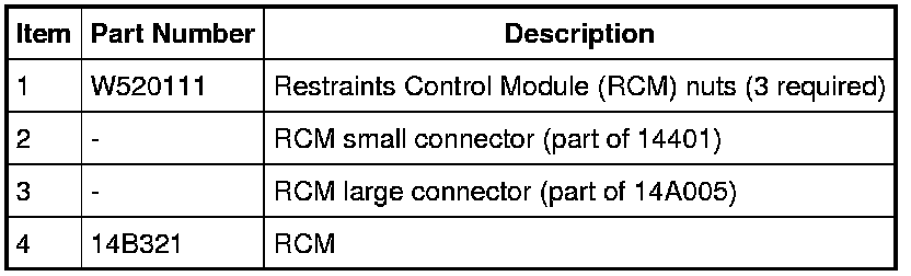 NOTE: When installing a new Restraints Control Module (RCM) always make sure the correct RCM is being installed. If an incorrect RCM is installed, erroneous DTCs will result.