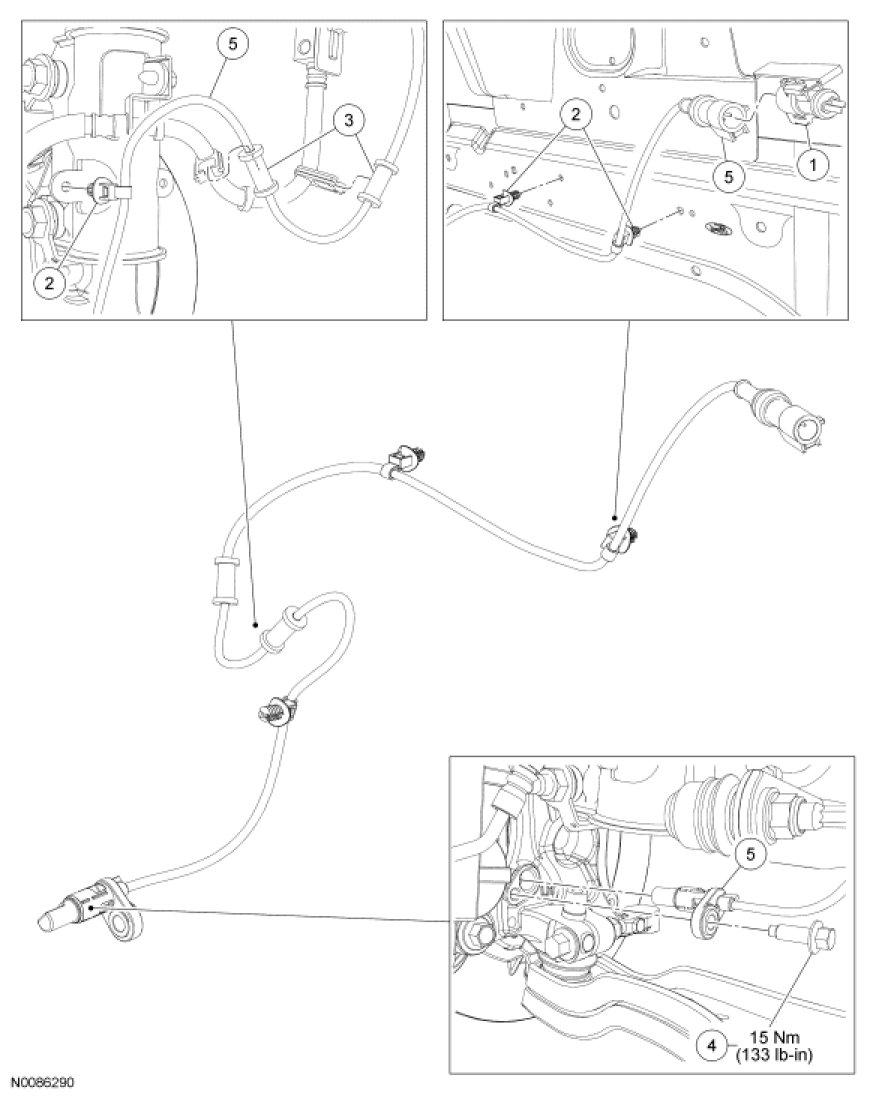 4. Disconnect the 2 wheel speed sensor grommet retainers from the brake hose clips.