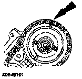 Install the RH timing chain on the camshaft sprocket, aligning the 2 colored links with the timing mark on the sprocket.