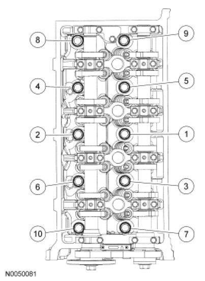 Tighten the new RH cylinder head bolts in 5 stages in the sequence shown.Stage 1: Tighten to 20 Nm (177 lb-in).