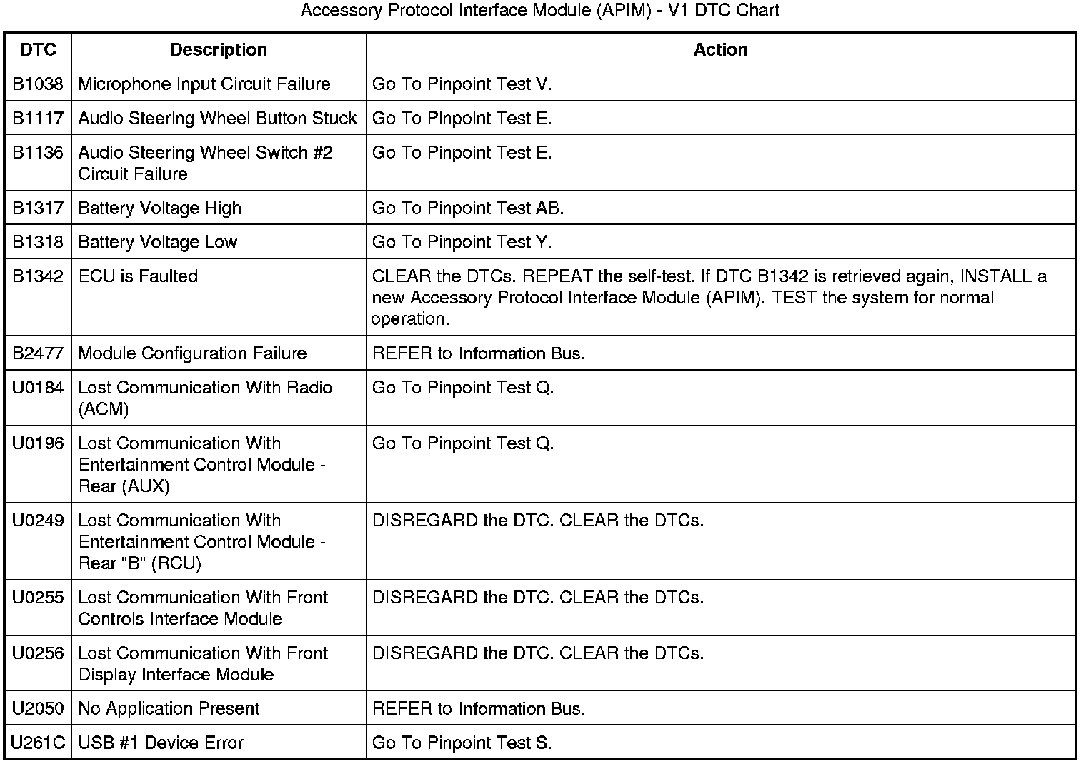 Accessory Protocol Interface Module (APIM) - V1 DTC Chart