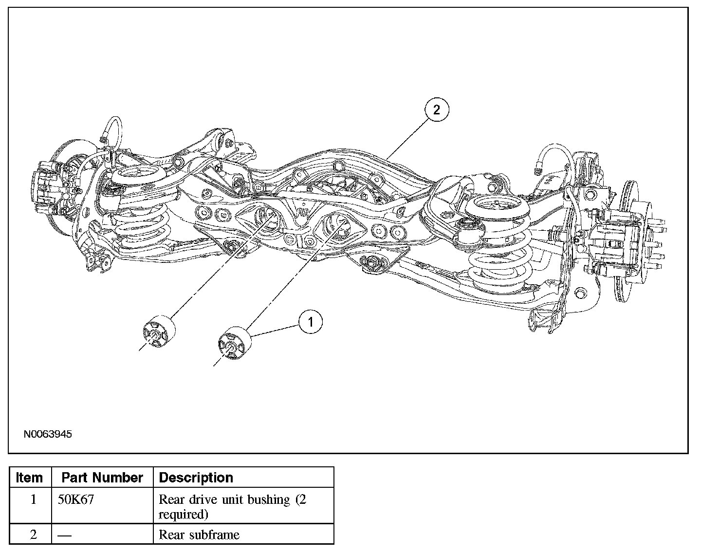 - When installing the RDU bushing, the Rear Drive Unit (RDU) Bushing Remover/Installers will fall away as the RDU bushing is installed into the subframe. The Rear Drive Unit (RDU) Bushing Remover/Installers do not control the depth of the bushing. The RDU bushing is fully seated when the Rear Drive Unit (RDU) Bushing Remover/Installer falls away from the subframe. Do not continue to tighten the Rear Drive Unit (RDU) Bushing Remover/Installer.