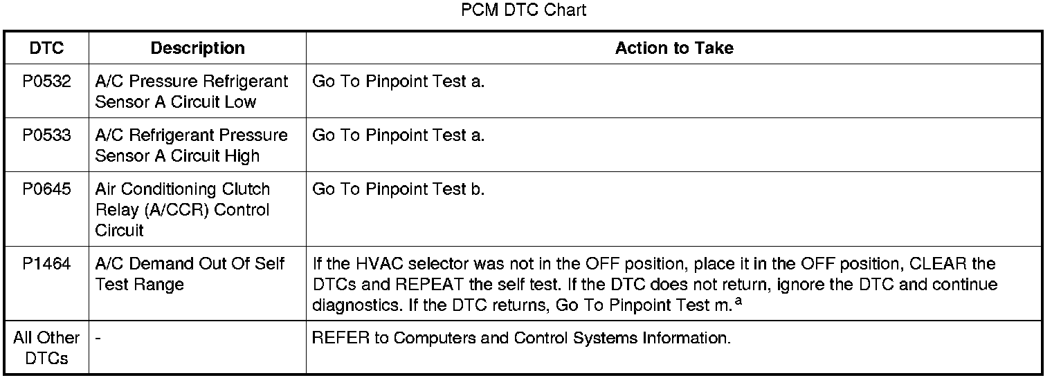 PCM DTC P1464 will set if the function selector is in PANEL with A/C button pressed, DEFROST or MAX A/C mode when the on-demand self test is being run.