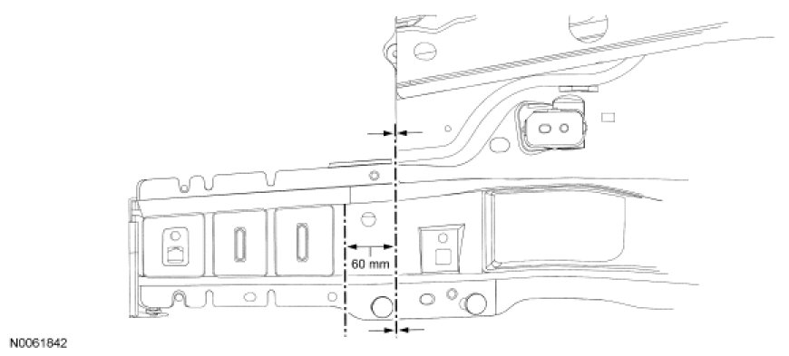 12. Scribe a cut-line 60 mm (2.36 in) rearward of the initial frame rail cut, on the outer portion of the rail assembly. Using a cut-off wheel or equivalent, cut and remove that portion of outer rail only. This will create an overlap joint.