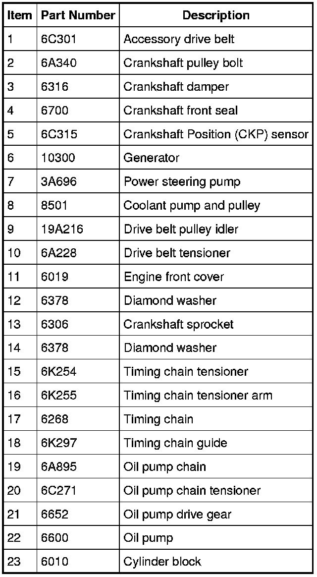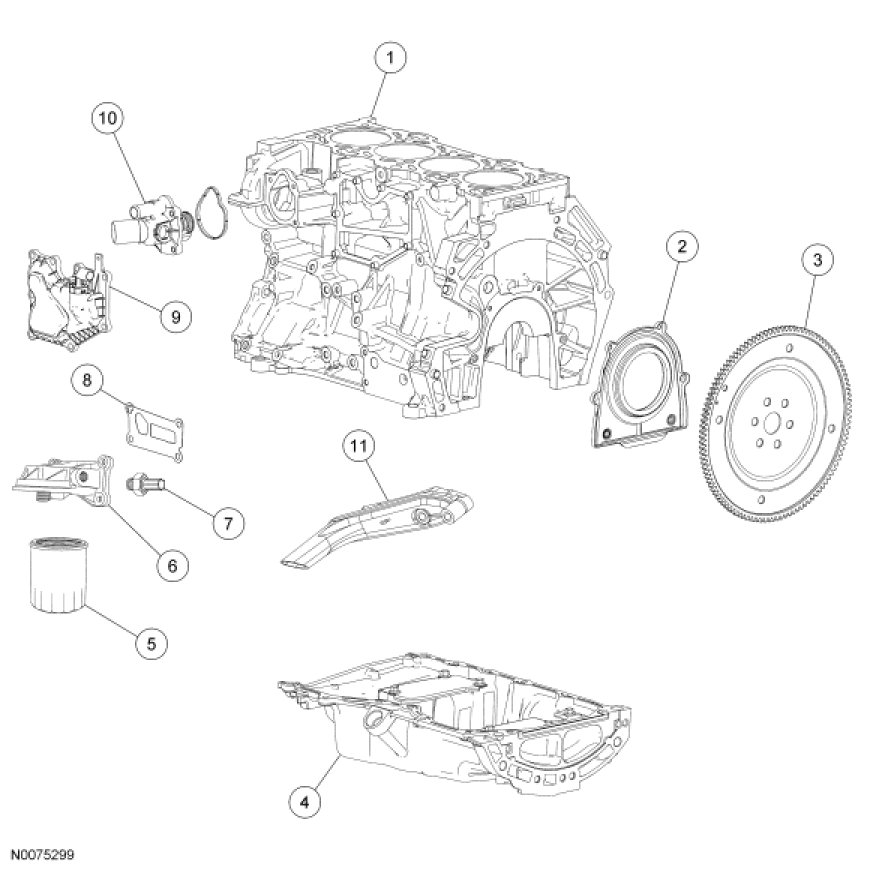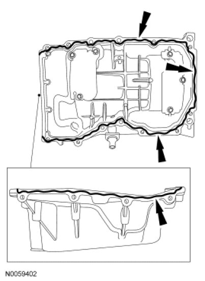 Apply a 2.5 mm (0.09 in) bead of silicone gasket and sealant to the oil pan-to-engine block and to the oil pan-to-engine front cover mating surface.