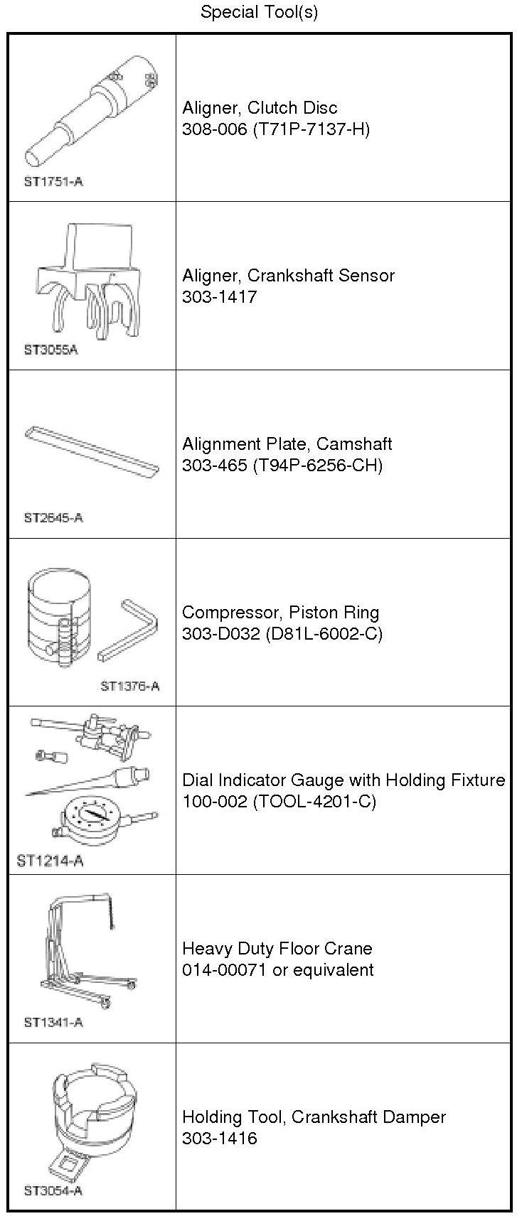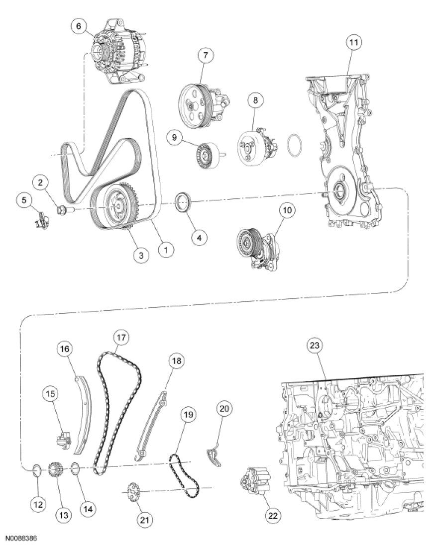 NOTICE: Do not loosen or remove the crankshaft pulley bolt without first installing the special tools as instructed in this procedure. The crankshaft pulley and the crankshaft timing sprocket are not keyed to the crankshaft. The crankshaft, the crankshaft sprocket and the pulley are fitted together by friction, using diamond washers between the flange faces on each part. For that reason, the crankshaft sprocket is also unfastened if the pulley bolt is loosened. Before any repair requiring loosening or removal of the crankshaft pulley bolt, the crankshaft and camshafts must be locked in place by the special service tools, otherwise severe engine damage can occur.