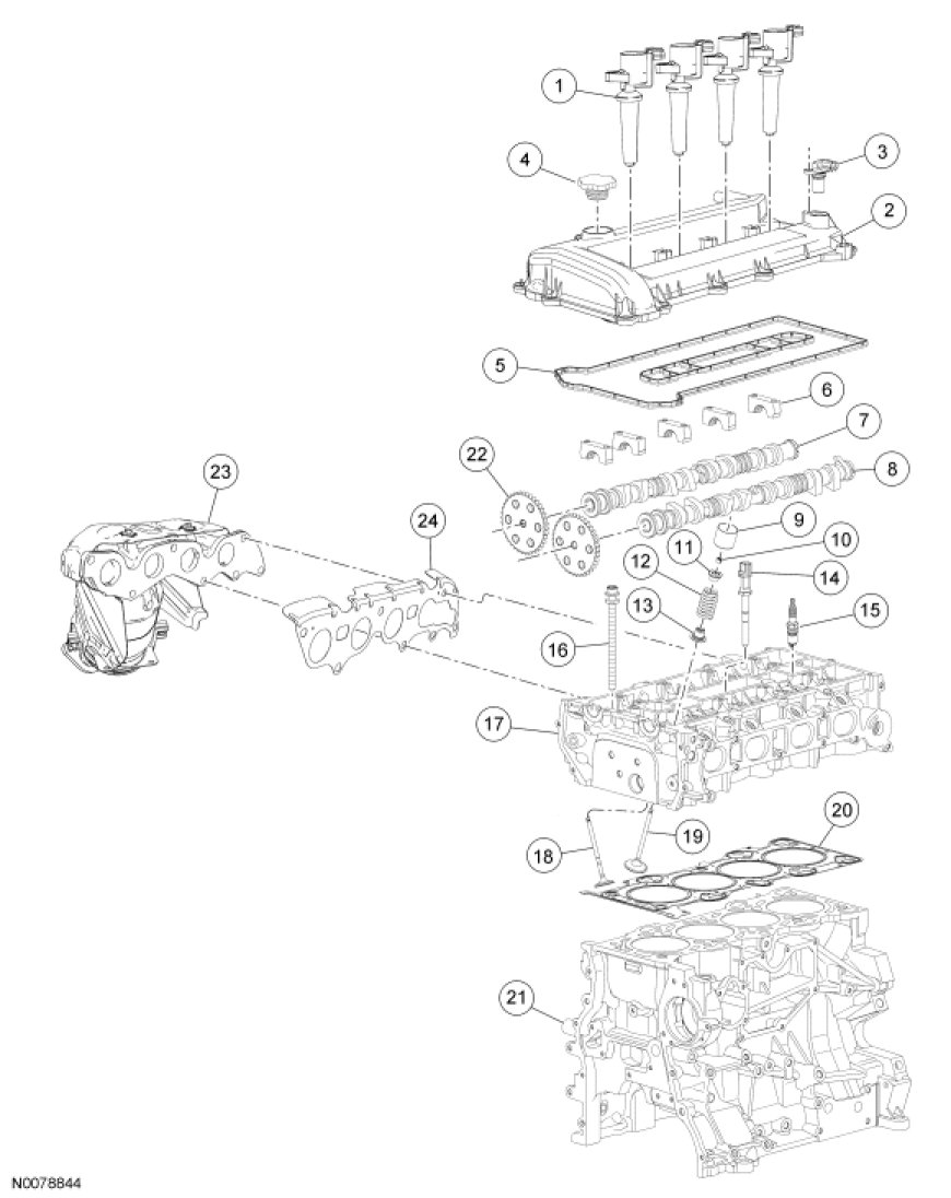 Install the camshafts and bearing caps in their original location and orientation. Tighten the bearing caps in the sequence shown in 3 stages: