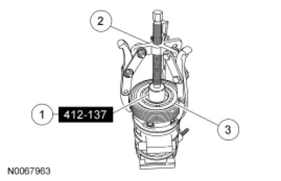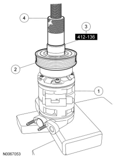 5. NOTICE: The Air Conditioning (A/C) compressor must be positioned on the press so that only the flat part of the A/C compressor housing is contacting the base with the A/C compressor shaft aligned with the center of the press shaft. If the A/C compressor is not installed correctly on the press, the A/C compressor and/or A/C compressor pulley will be damaged.