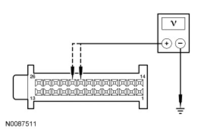 - Measure the voltage between ground and HVAC module C2357A-7, circuit VH439 (GY/VT), harness side.