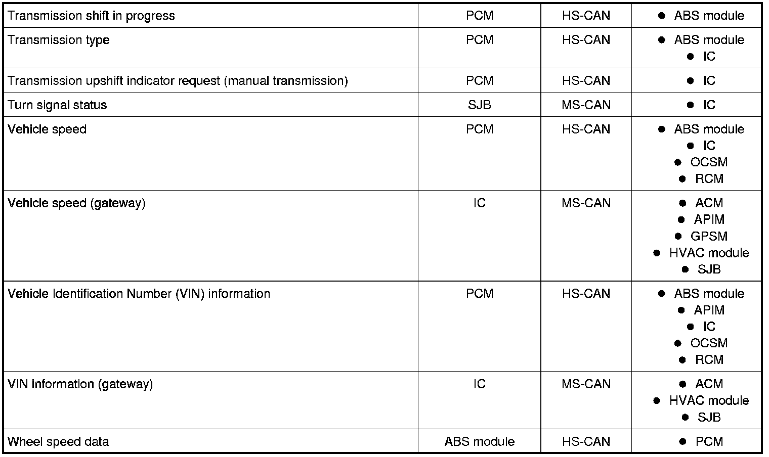 NOTE: This chart describes the specific HS-CAN and MS-CAN messages broadcast by each module, and the module(s) that receive the message.