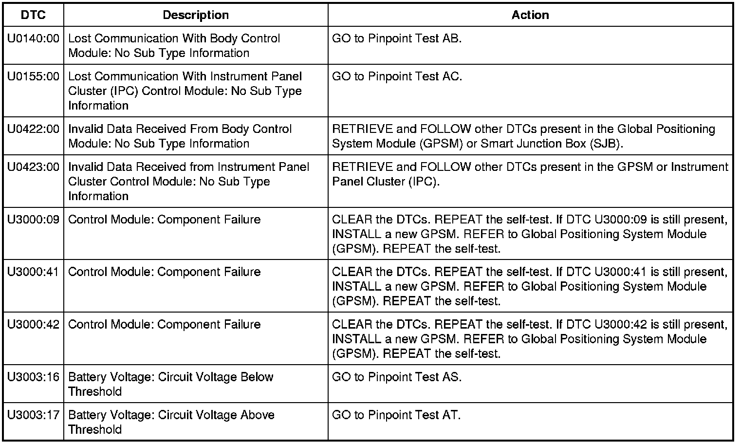 NOTE: This module utilizes a 5-character DTC followed by a 2-character failure-type code. The failure-type code provides information about specific fault conditions such as opens, or shorts to ground. Continuous memory DTCs have an additional 2-character DTC status code suffix to assist in determining DTC history.