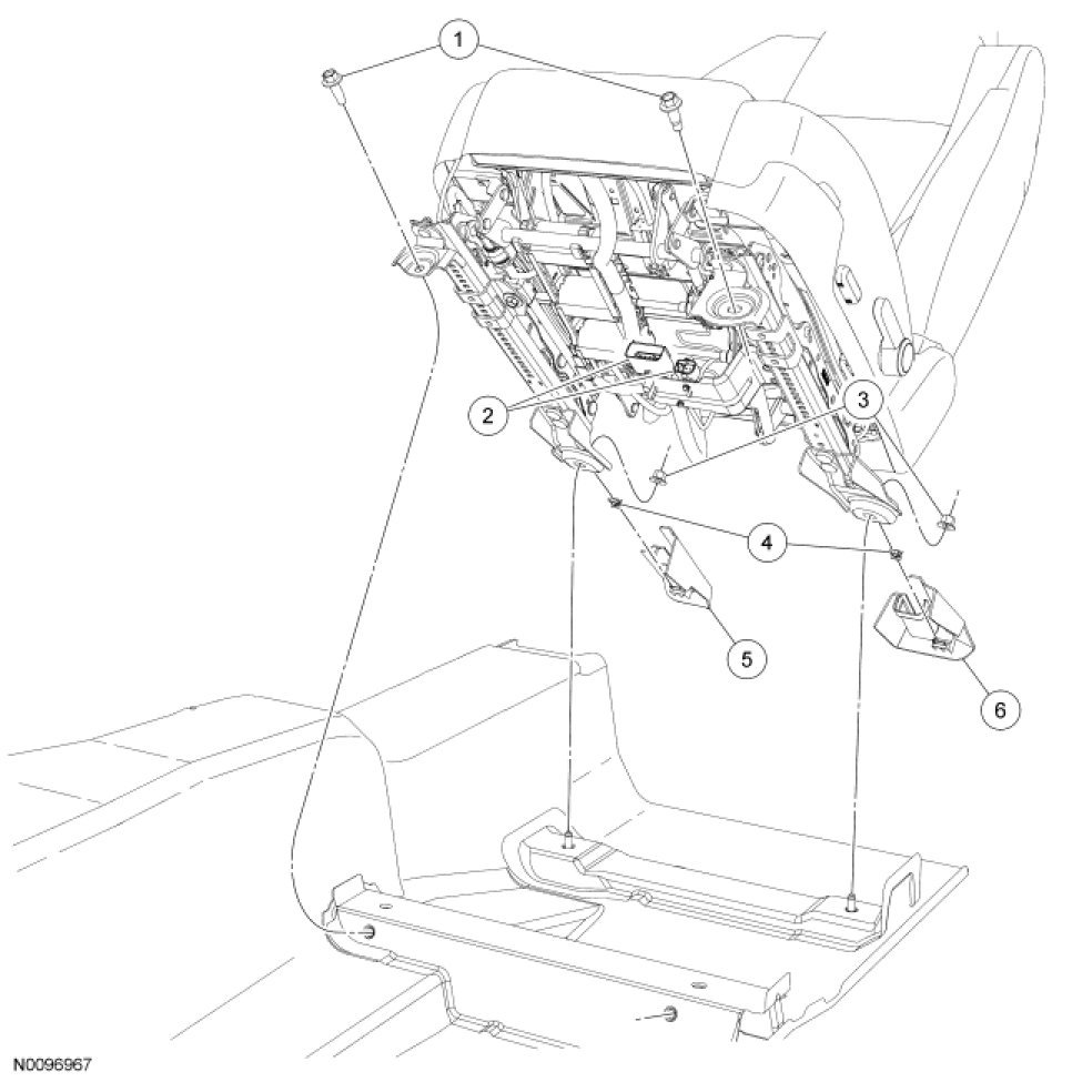 1. Position the seat to access all seat mounting fasteners and depower the SRS. For additional information, refer to Supplemental Restraint System (SRS) Depowering and Repowering in the General Procedures portion of Restraint Systems.