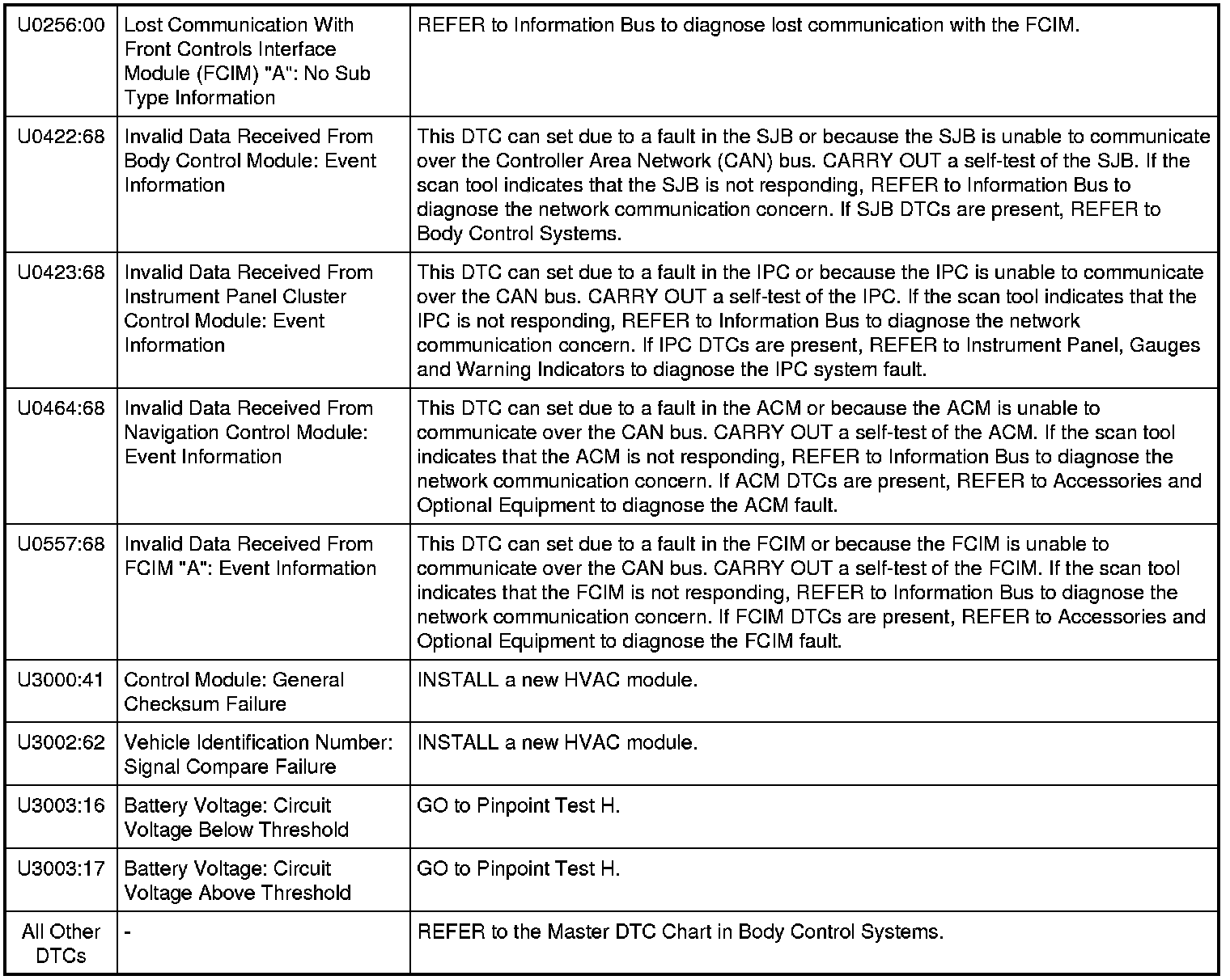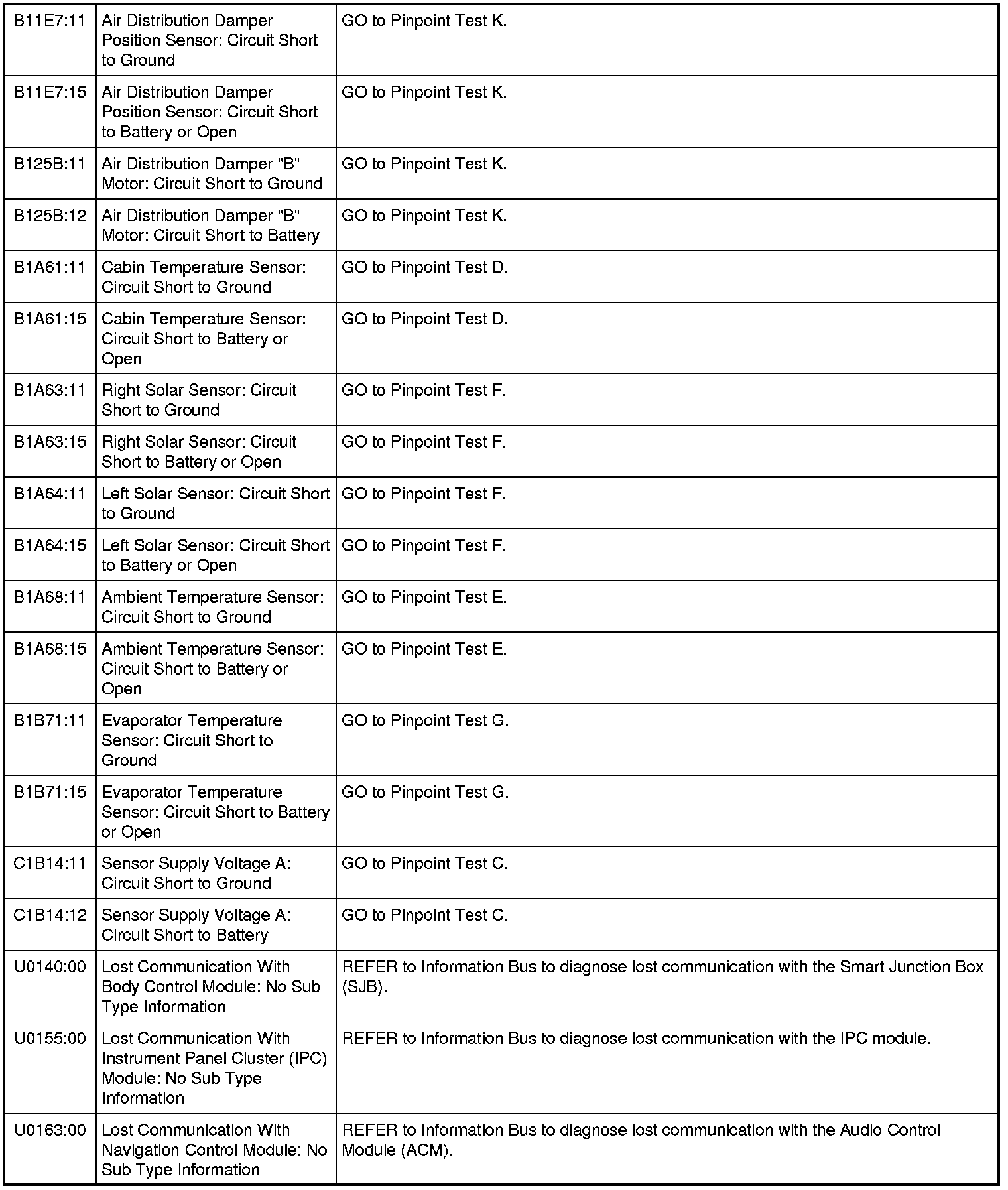 NOTE: Some PCM DTCs may inhibit A/C operation. If any PCM DTCs are retrieved, diagnose those first. Refer to the PCM DTC Chart. PCM DTC Chart