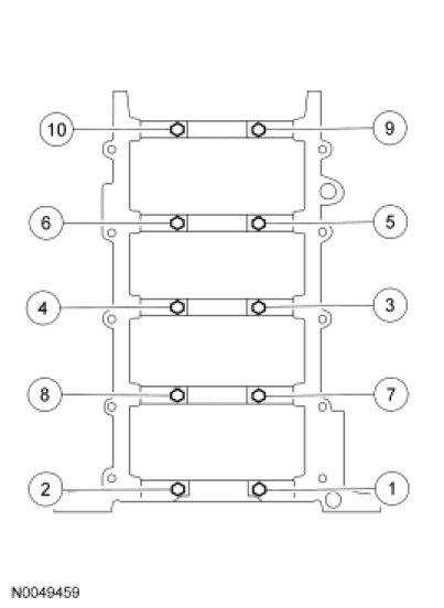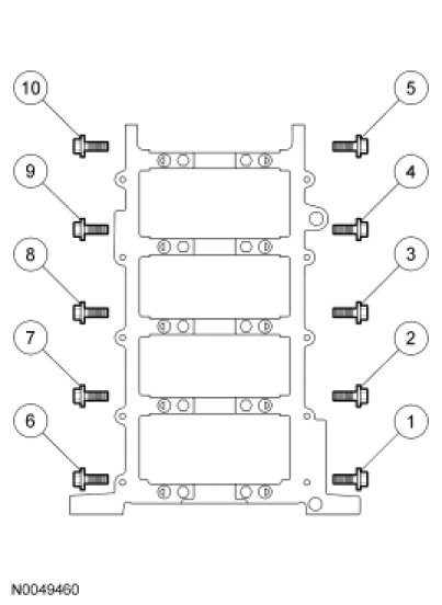 Install the new side bolts and tighten them in the sequence shown, in 2 stages.