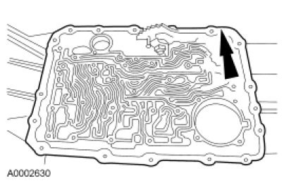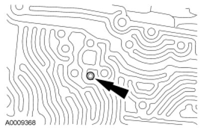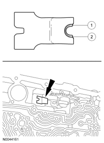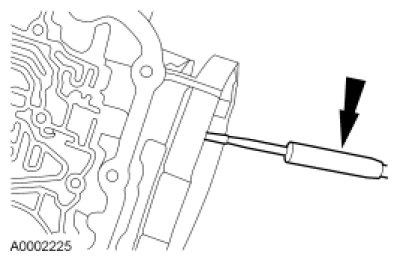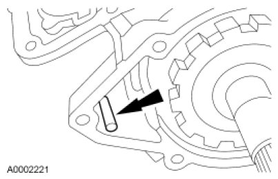 12. NOTICE: Use care not to damage the transmission fluid pan rail surface when installing the retaining pin.