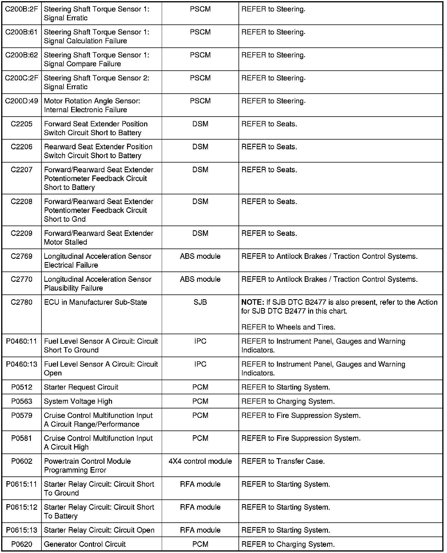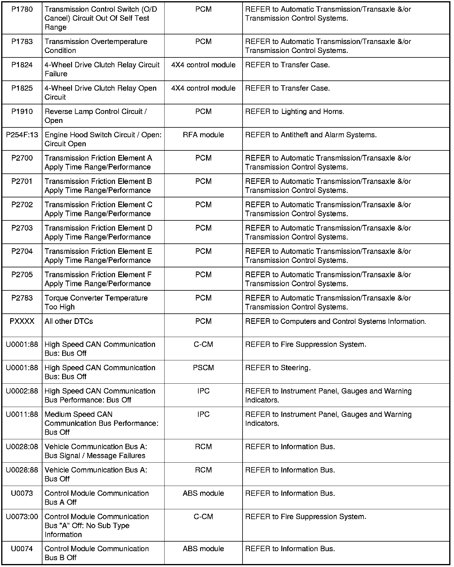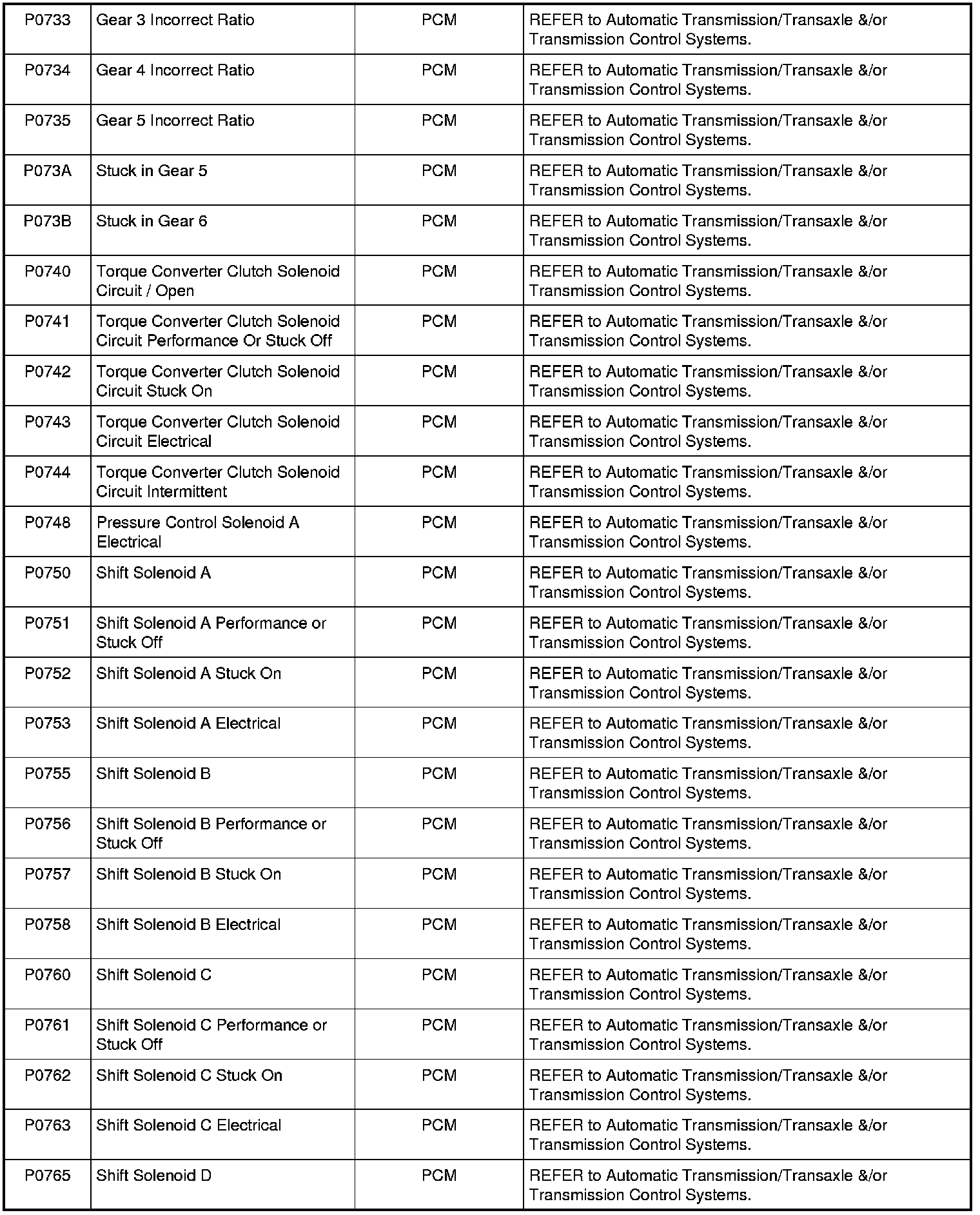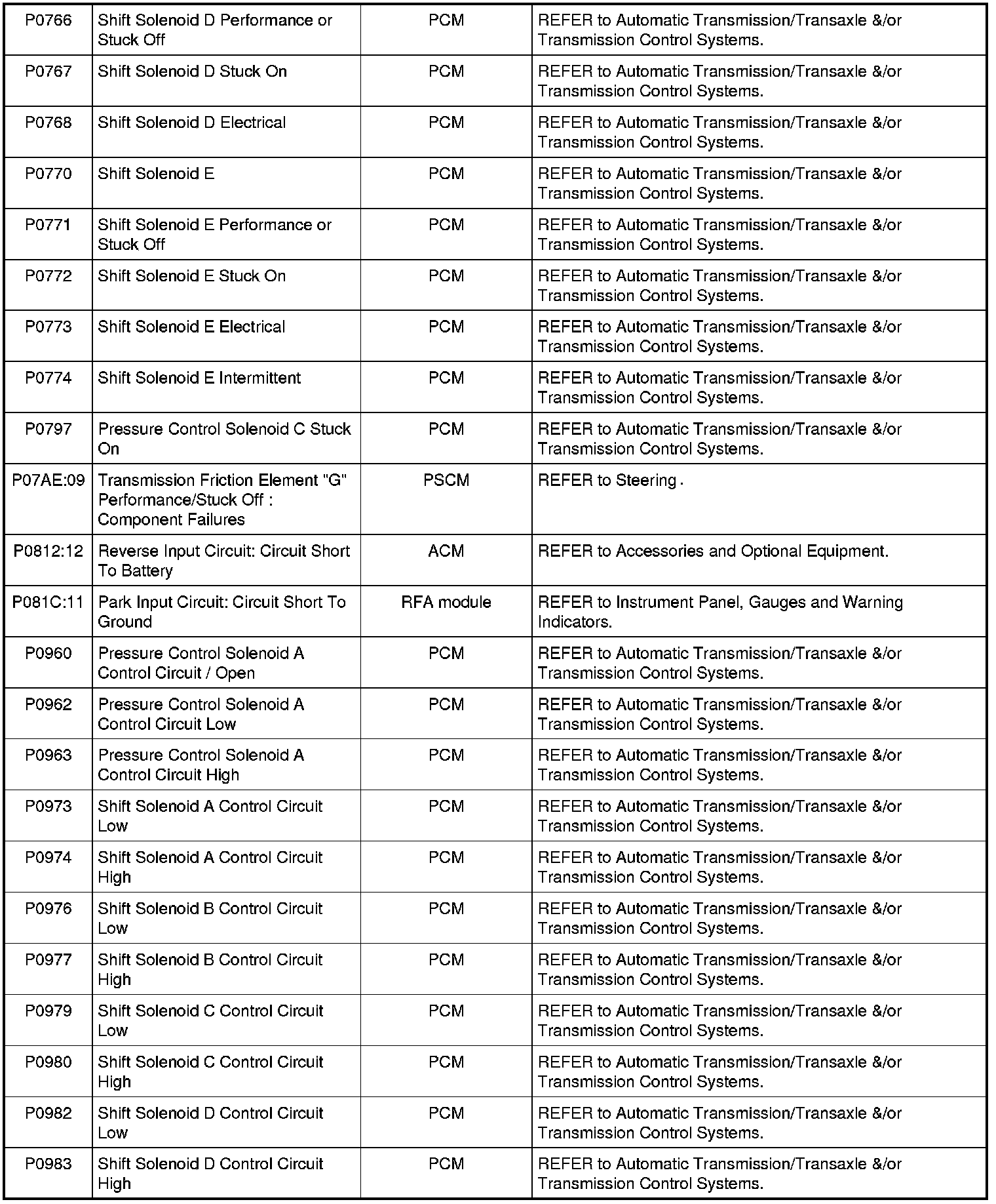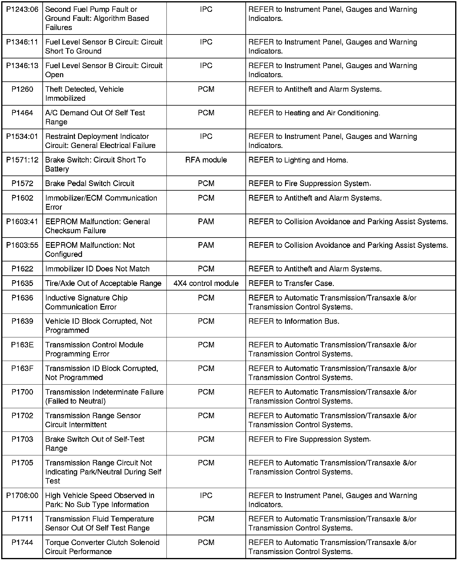 NOTE: Most powertrain (P-code) DTCs are diagnosed in Computers and Control Systems Information. If the P-code retrieved is not listed below, refer to Computers and Control Systems Information to continue diagnostics.