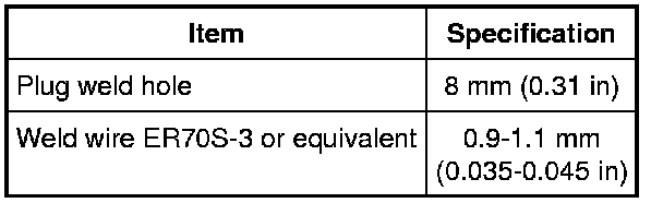 - Factory spot welds may be substituted with either STRW or MIG plug welds. Spot/plug welds should equal factory welds in both location and quantity. Do not place a new spot weld directly over an original weld location. Plug weld hole should equal 8 mm (0.31 in) diameter.