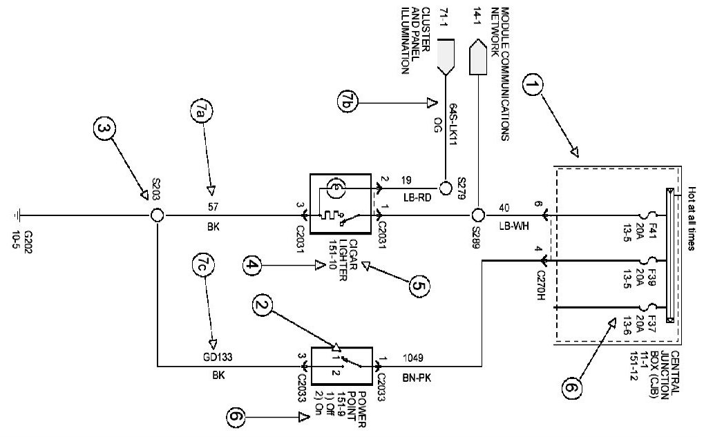 Ford Motor Company uses three different circuit numbering conventions: Standard Circuit Numbering System, Global Circuit Numbering System, and New Global Circuit Numbering System (NGCNS). With each, the circuit number (which identifies a specific circuit function) is followed by the wire color.
