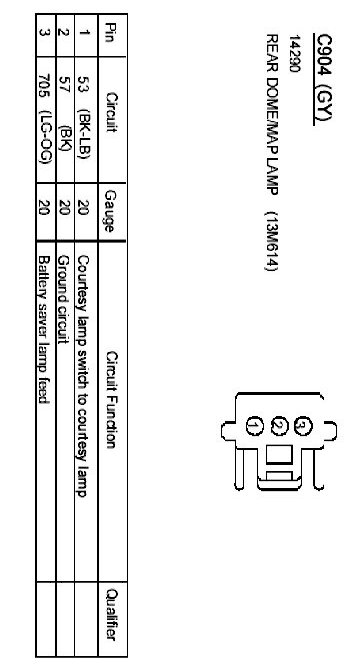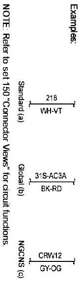 Connector Views show the views of the pins and/or cavities of all connectors. The pin and cavity sides are shown separately as if the connector were disconnected. The color of the connector housing is indicated next to the connector number when available. The harness causal number is located above the connector view and below the connector number. The circuit function charts are located below each connector. The wiring harness designations are listed in Component Location Charts.