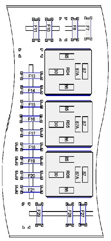 Fuse/Locations and Relay/Locations contains a view of the fuse/relay box, in which all fuses and relays are identified, numbered and named. Fuse and relay numbering and naming follow the indication of the fuse panel cover. In addition, for all removable relays, pin positions are added to illustrate proper orientation.